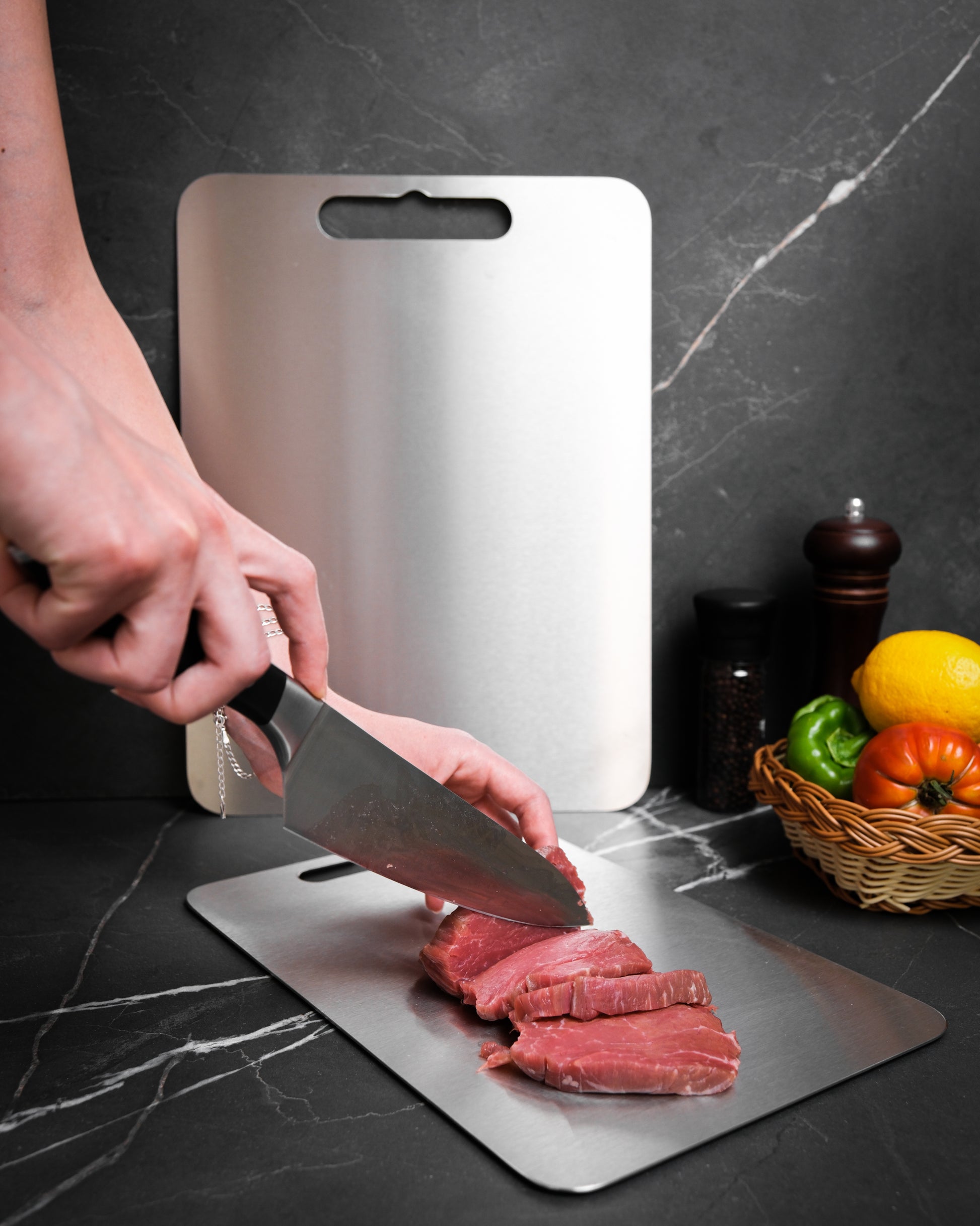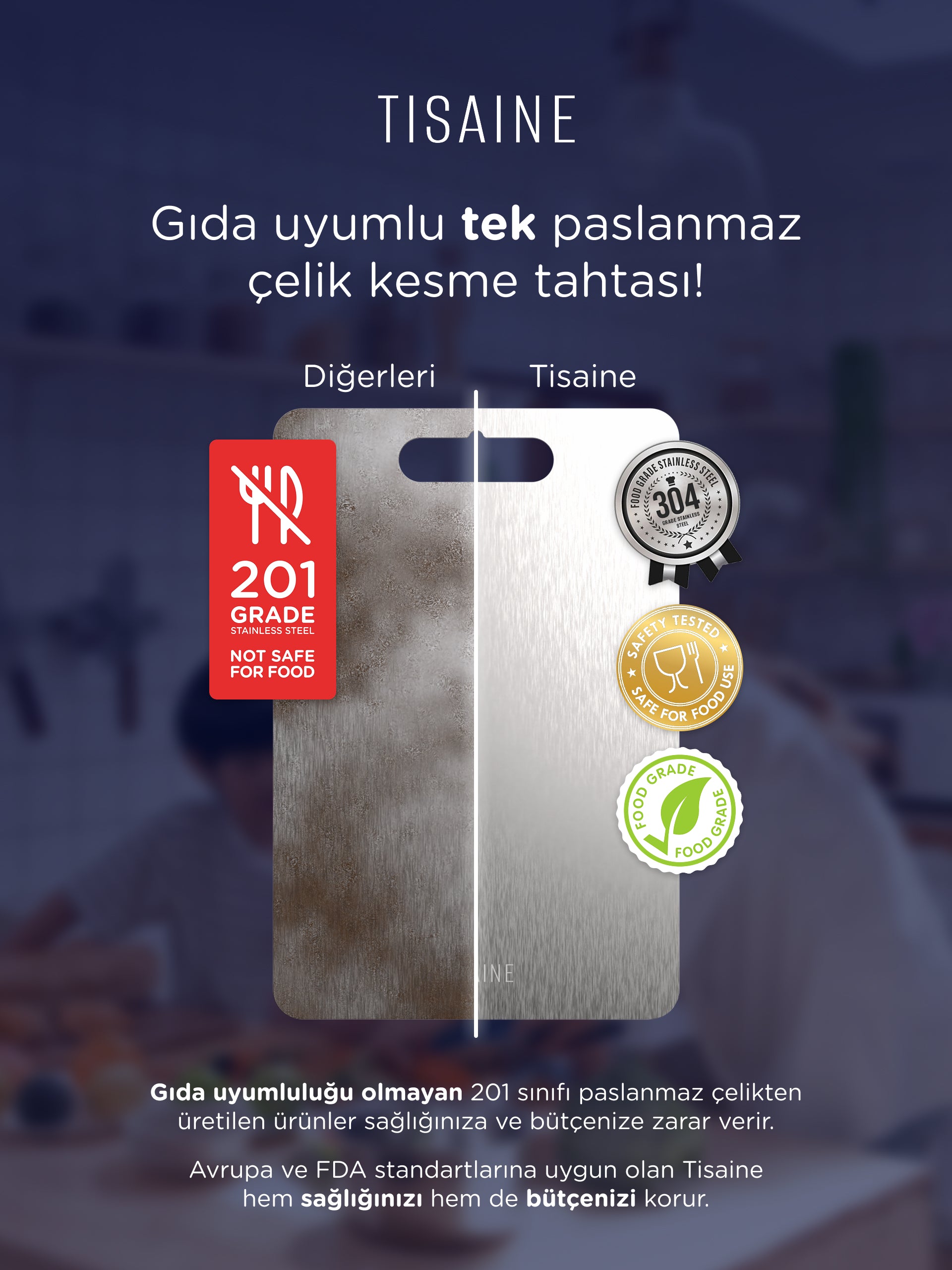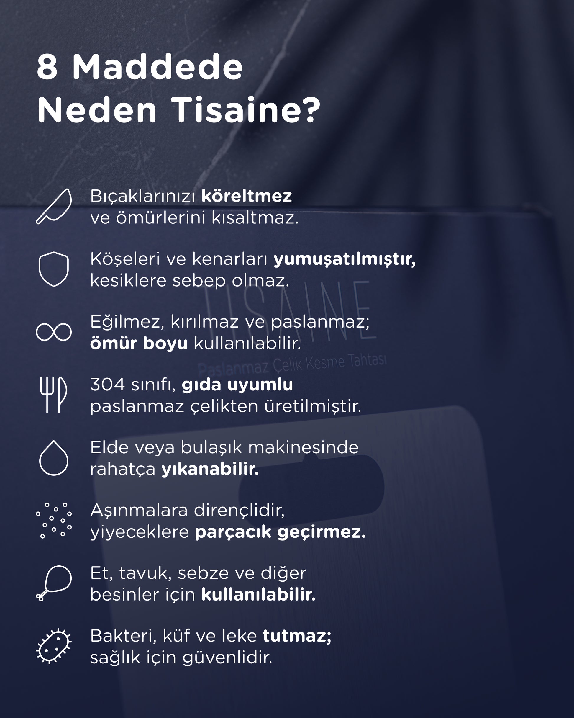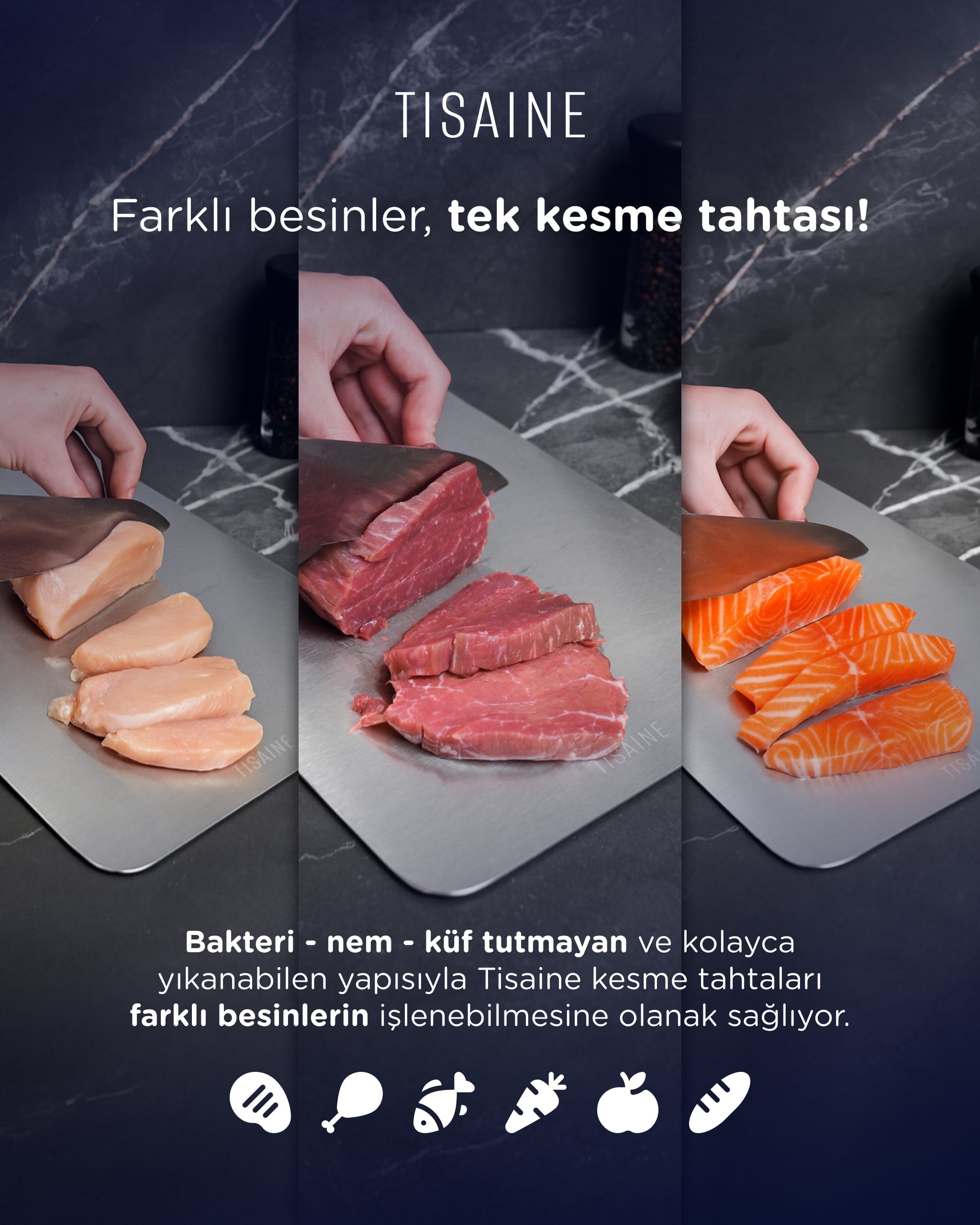 TISAINE paslanmaz çelik kesme tahtası, mutfağınız için sadece bir araç değil, daha güvenli, temiz ve pratik bir yaşam tarzının anahtarıdır. Dayanıklı yapısı, koku ve leke tutmayan yüzeyi ve bıçak dostu tasarımıyla yemek hazırlıklarınızı daha keyifli hale getirir.