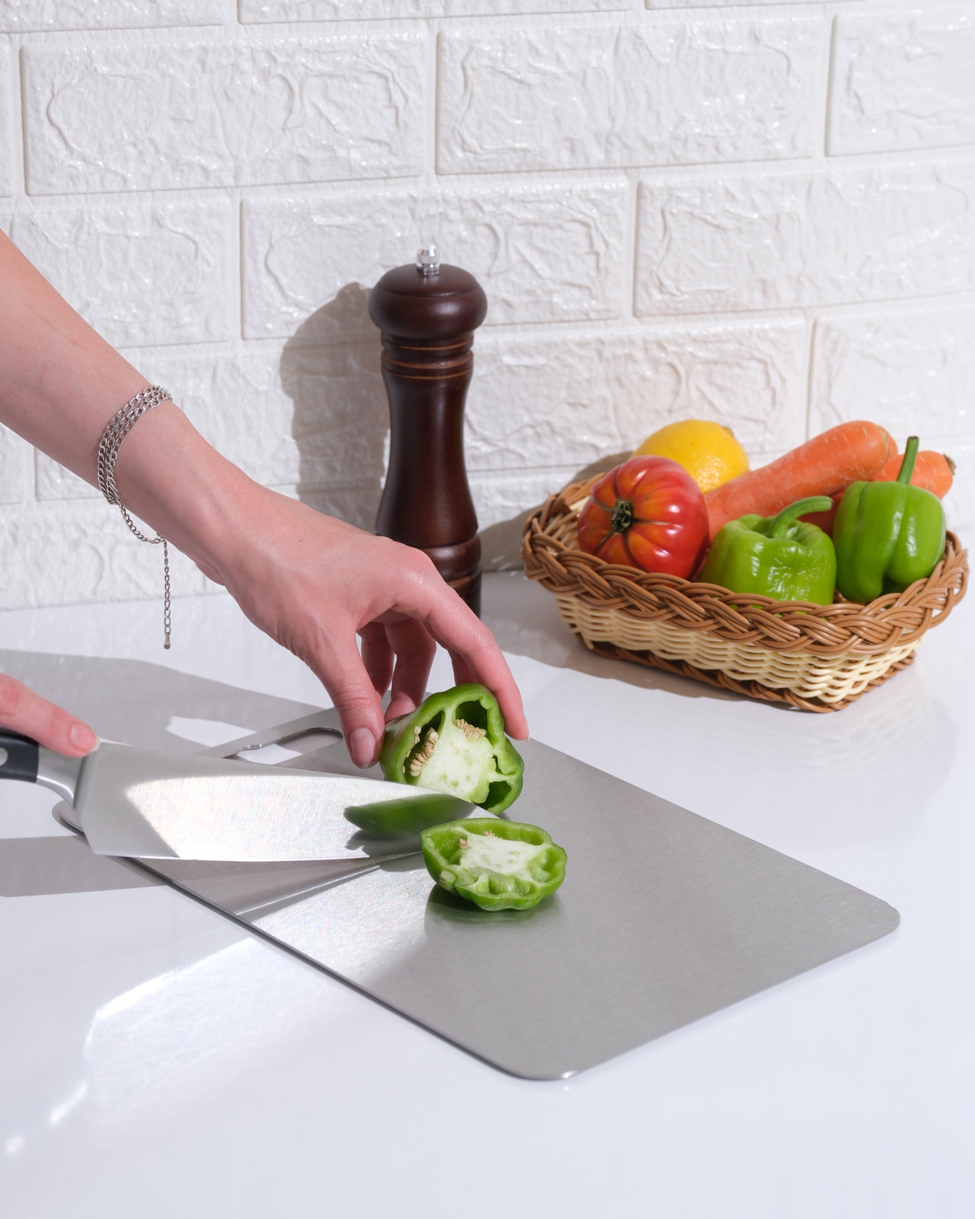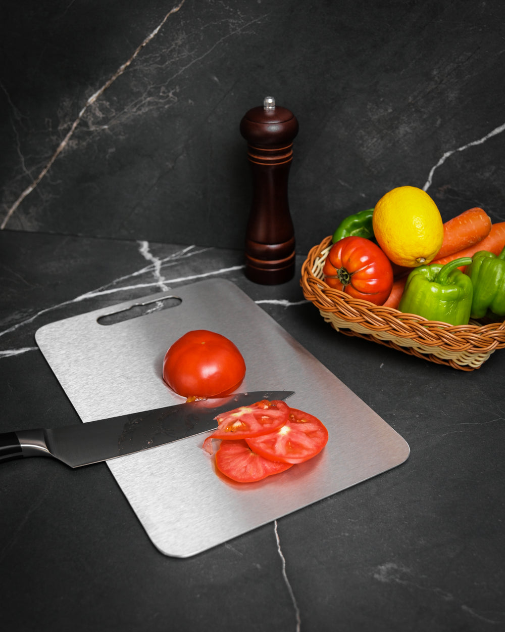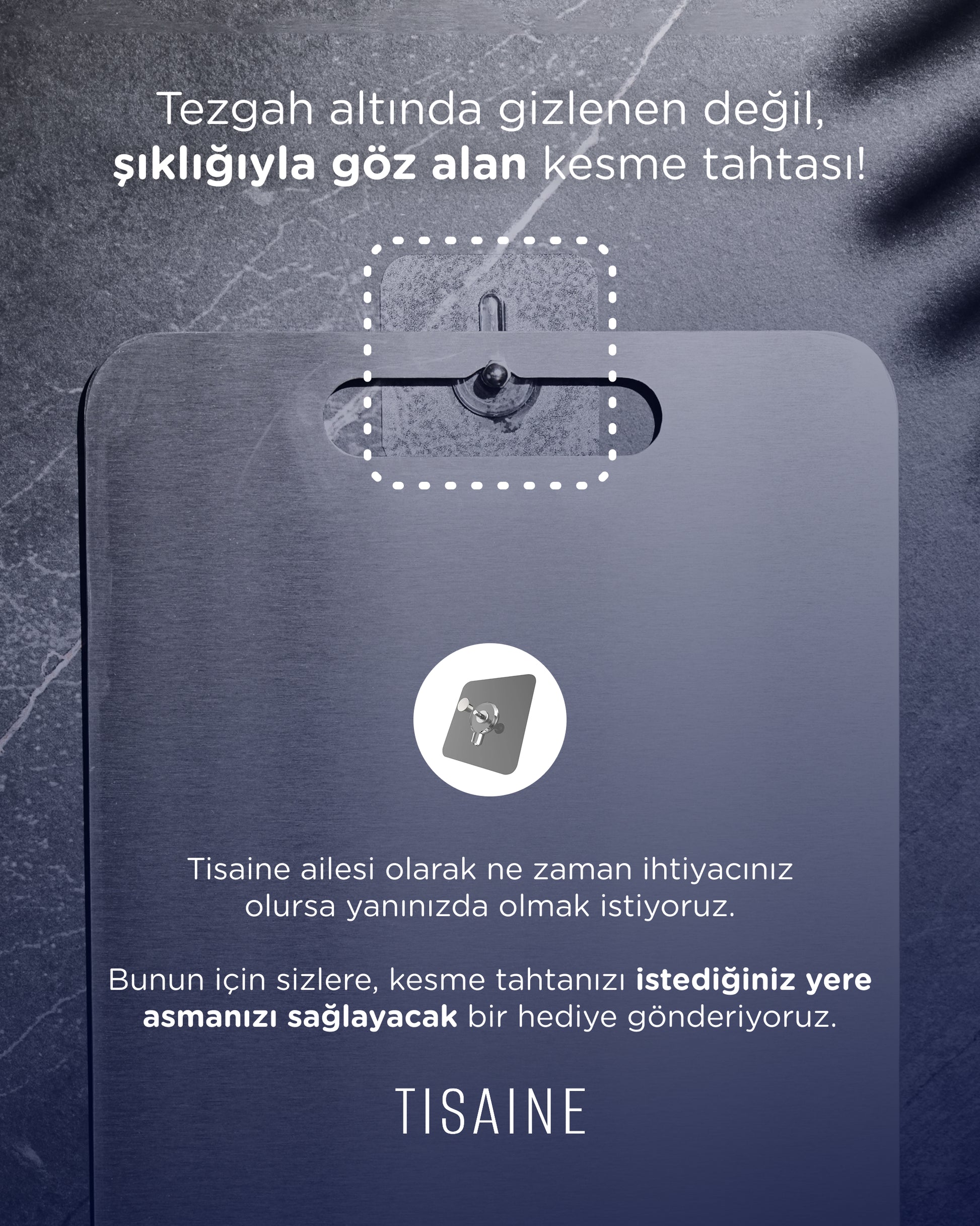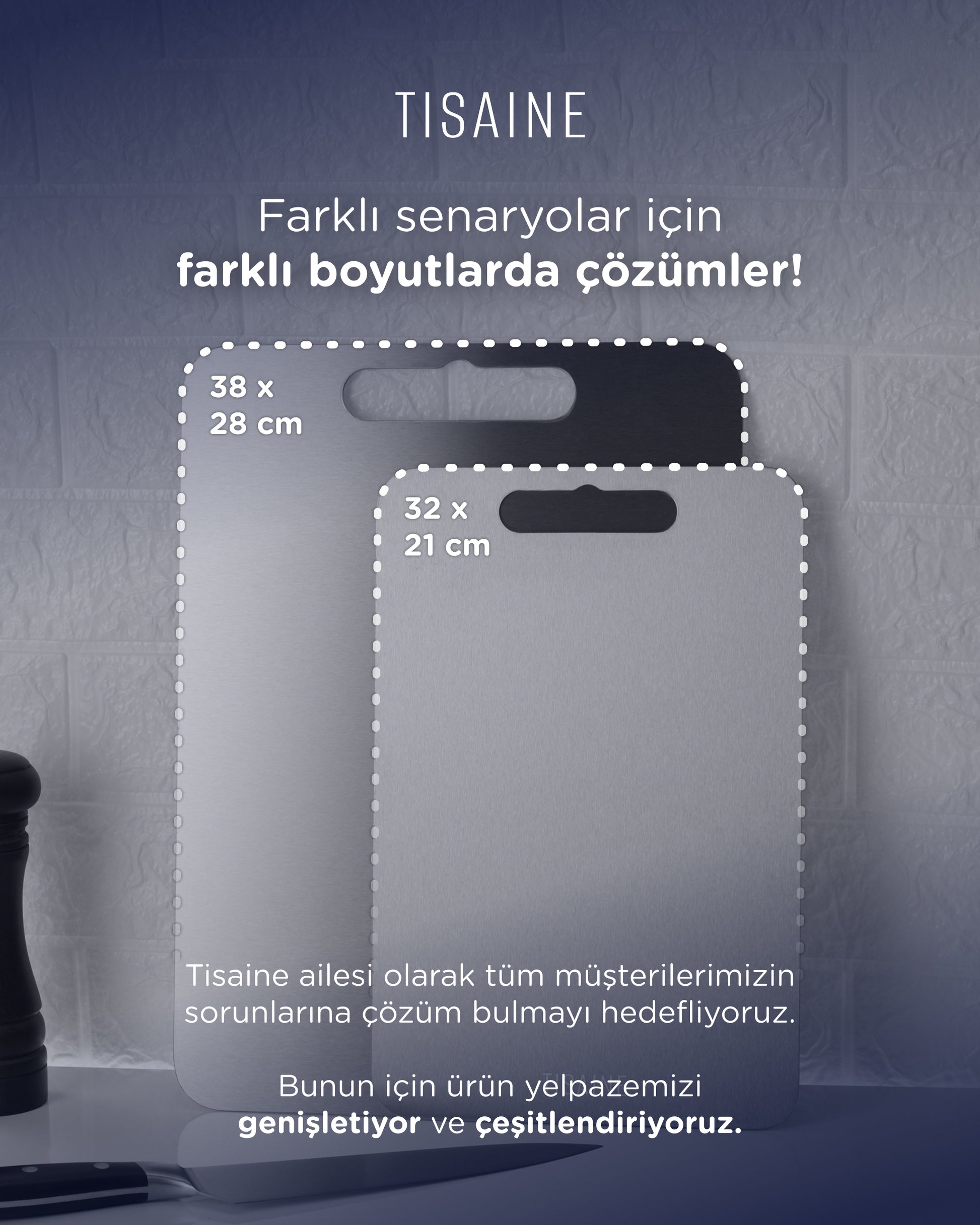 TISAINE paslanmaz çelik kesme tahtası, mutfağınıza şıklık katarken hijyenik ve kolay temizlenen yüzeyiyle sağlıklı bir kullanım sunar.