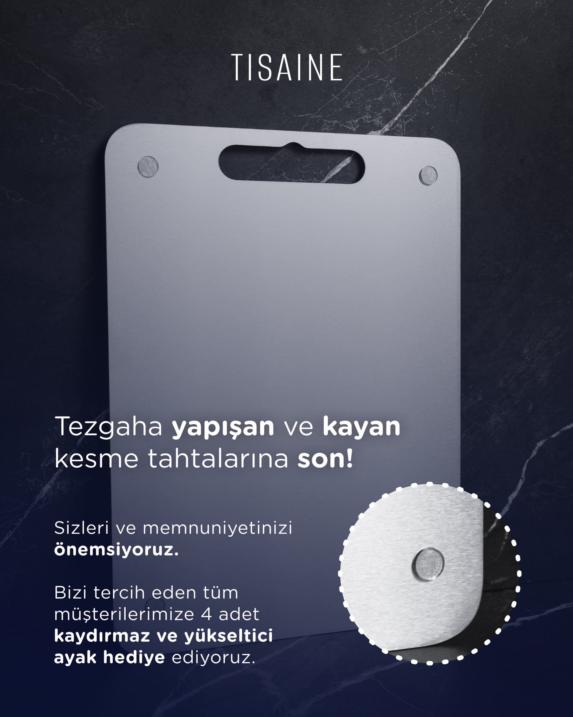 Paslanmaz çelik kesme tahtamız, yanında gönderdiğimiz kaymaz silikon ayaklar sayesinde kullanım sırasında sabit kalır. Kesim yaparken güvenliğiniz ve konforunuz ön planda tutularak tasarlanmıştır. TISAINE ile mutfakta daha kontrollü ve keyifli bir deneyim yaşayın!