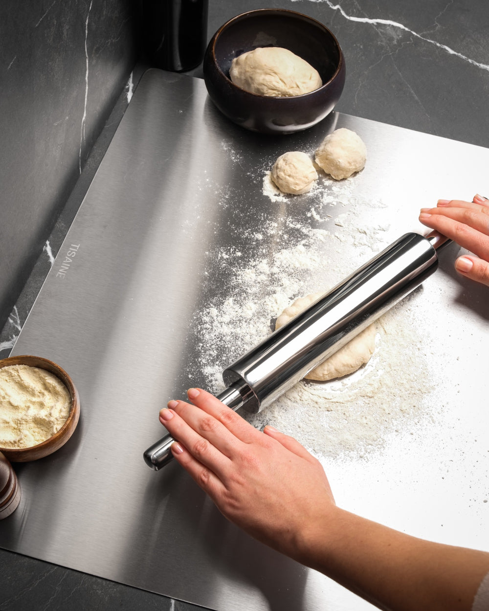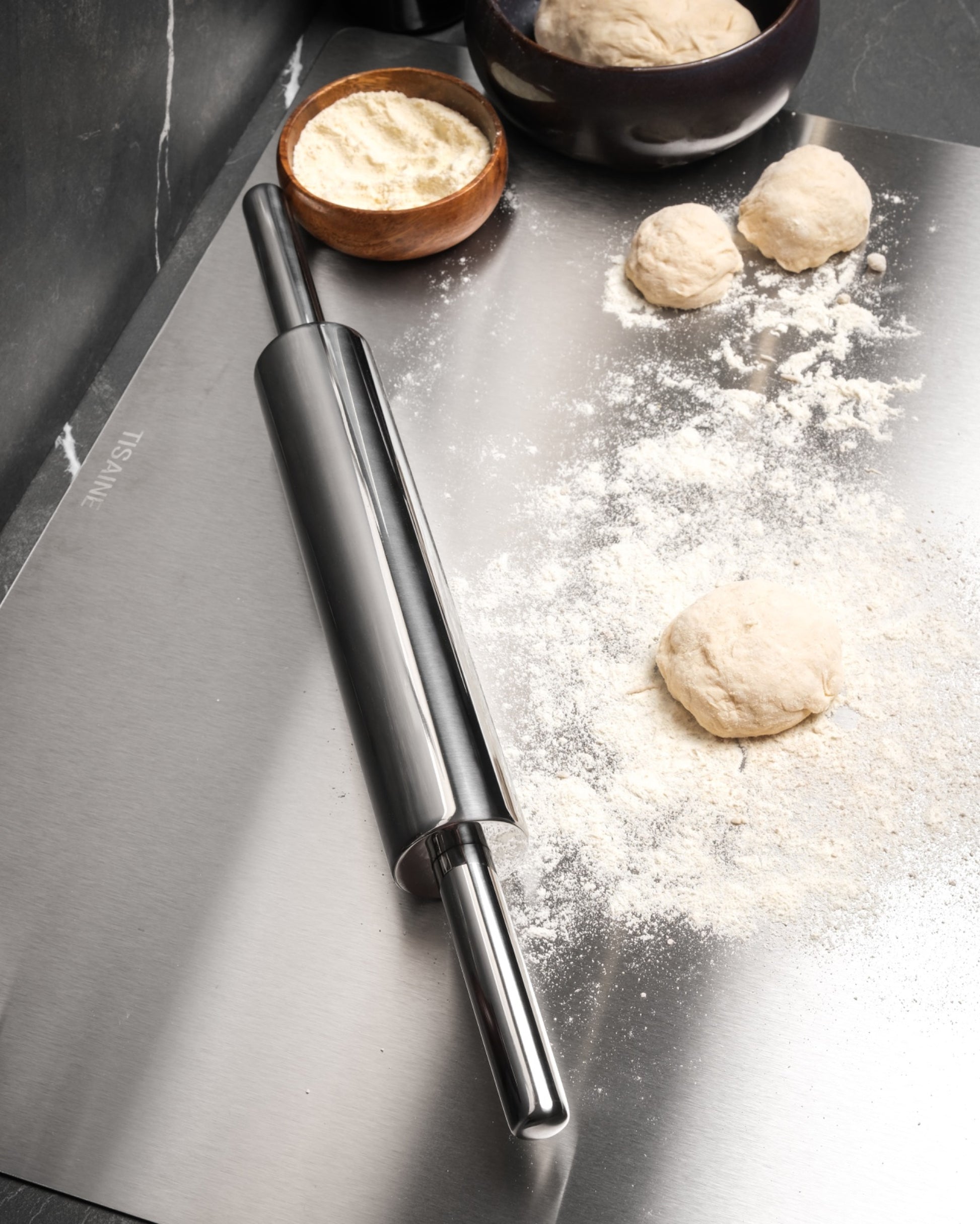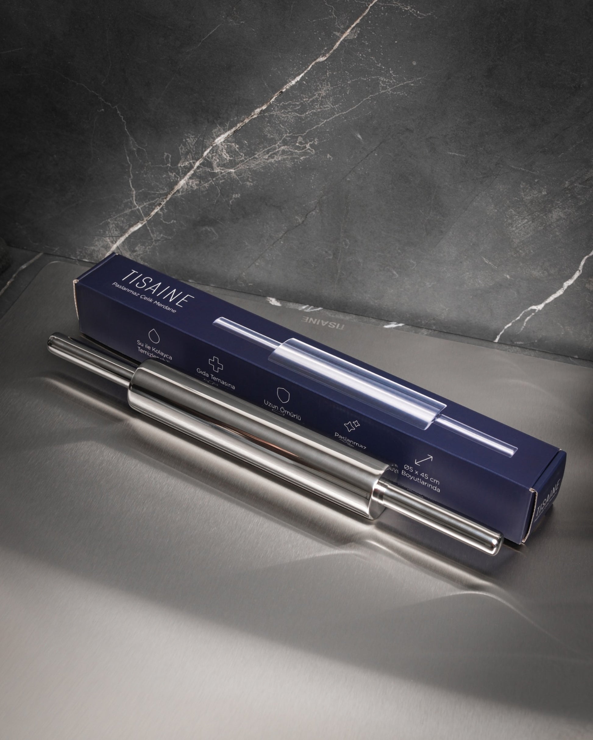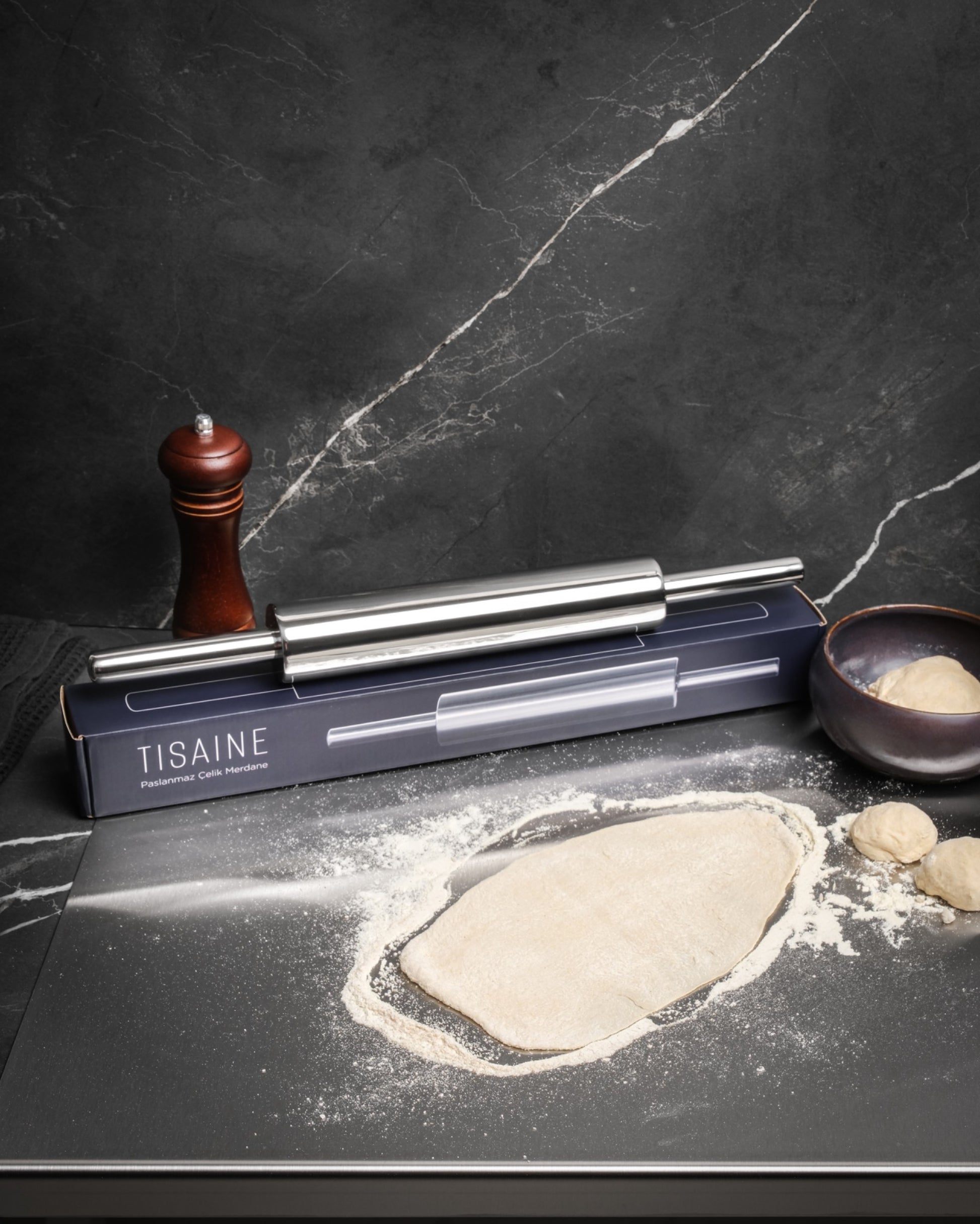 TISAINE™ paslanmaz çelik merdane, ideal çapı ve dengeli ağırlık dağılımıyla hamurun üzerine eşit baskı uygulayarak zahmetsiz bir açma deneyimi sunar.