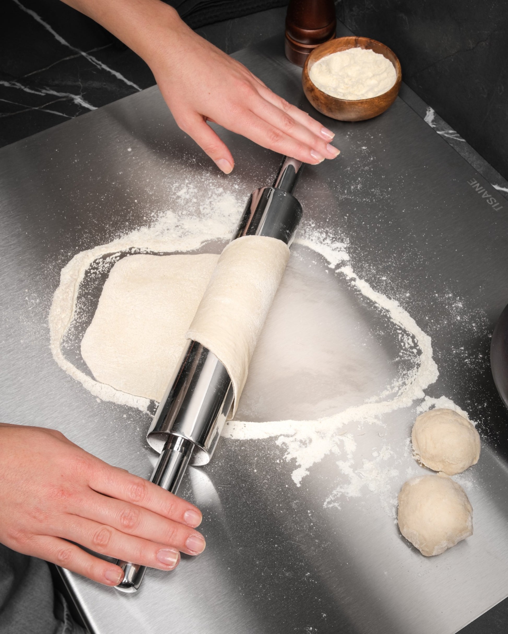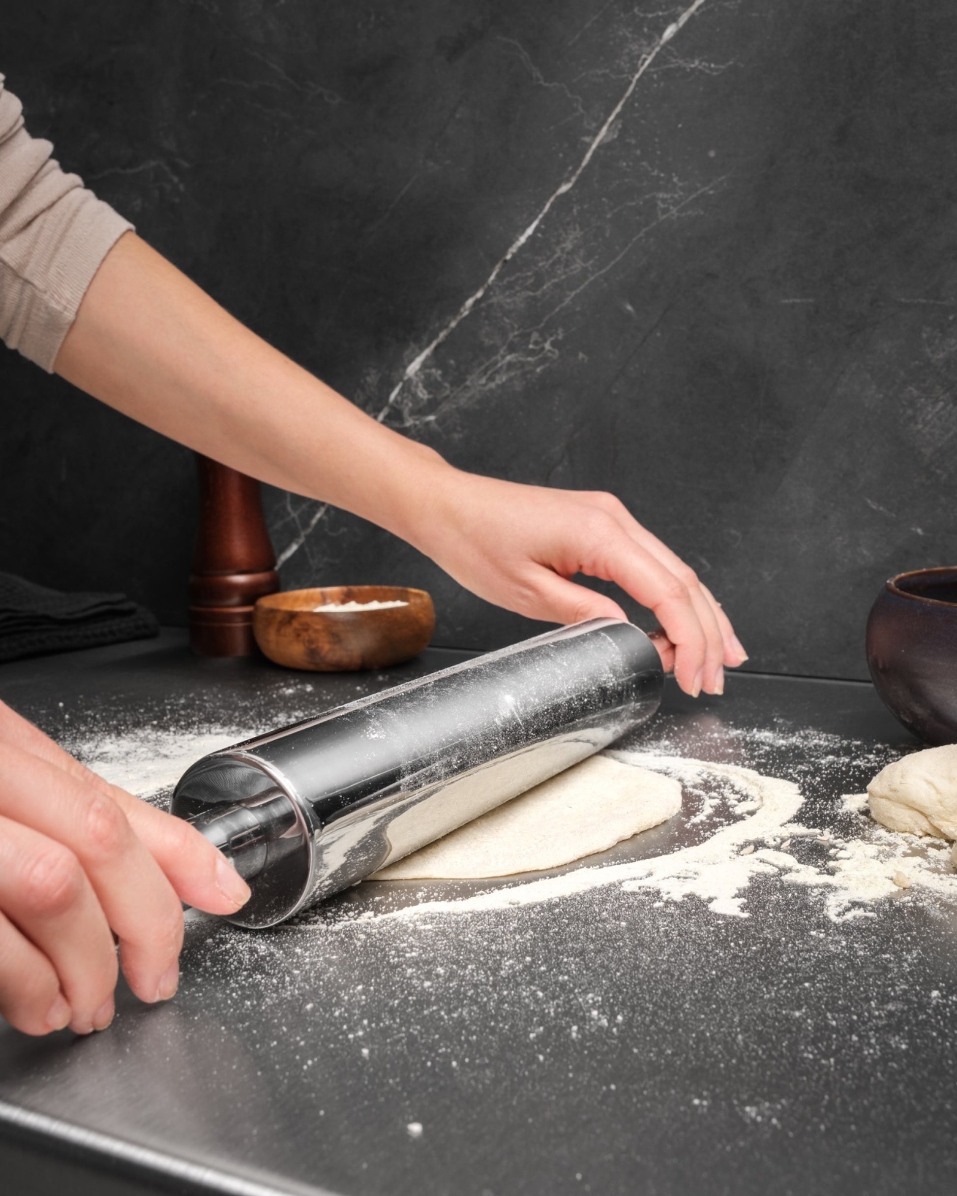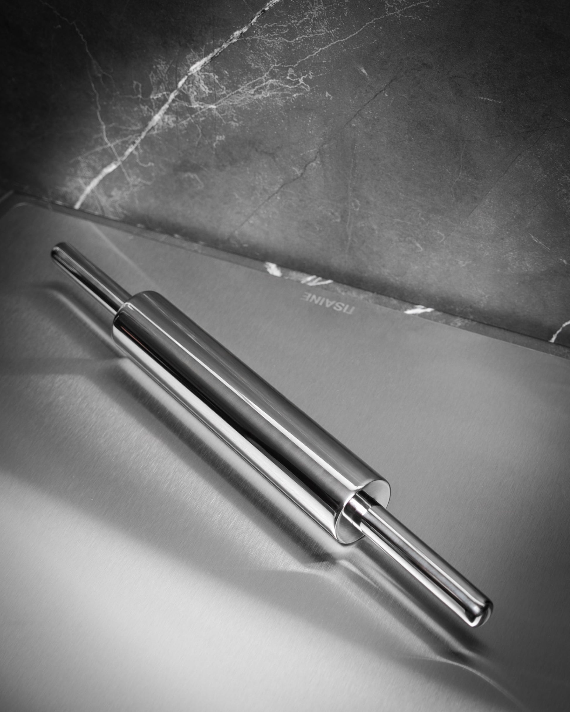 TISAINE™ paslanmaz çelik merdane, ideal çapı ve dengeli ağırlık dağılımıyla hamurun üzerine eşit baskı uygulayarak zahmetsiz bir açma deneyimi sunar.